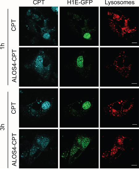 Figure 4: Successful internalization of CPT fused to ALOS4. Confocal images of live WM-266-4 cells over-expressing histone H1E-GFP (nuclear marker, green) that were incubated with CytoPainter Lysosomal Staining dye (lysosomal marker, red) and 10 μM CPT or ALOS-4 CPT for 1 hour and 3 hours. Scale bar: 10 μm.