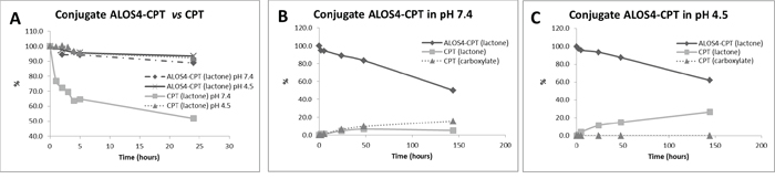 Figure 5: Chemo-stability of the free CPT and ALOS4-CPT conjugate at pH=4.5 and 7.4. A. Comparative stability of ALOS4-CPT vs free CPT. B, C. Chemo-stability of ALOS4-CPT and CPT release from the conjugate at pH 7.4 and 4.5, respectively. The drugs stability analyzed by LC-MS. All samples were injecting twice.