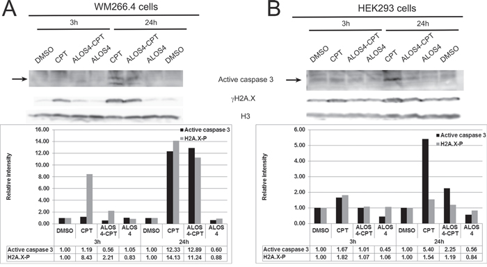 Figure 6: ALOS4-CPT conjugate specifically induces DSBs and caspase 3 activation in WM-266-4 cells. Western blot analyses with antibodies recognizing γH2A.X, active caspase 3 and histone H3 of lysates from cells treated with the indicated drugs for 3 hours and 24 hours. In each lane the band intensities of γH2A.X and active caspase 3 were quantified with ImageJ and normalized to the relative amount of histone H3. The graphs show the relative band intensities. The sample of the 3 hours DMSO treated cells was set as 1. A. WM-266-4 human metastatic melanoma B. non-malignant HEK293 cells.