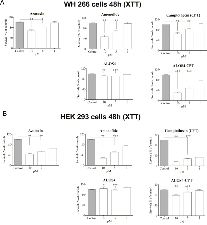Figure 7: The effect of ALOS4-CPT conjugate on WM-266-4 cells growth. The effect on cell growth of ALOS4-CPT vs the free anti-cancer drugs AM, AZA and CPT was studied by the XTT assay on A. WM-266-4 human metastatic melanoma and B. non-malignant HEK293 cells. The average relative amount of cells in comparison to control cells ±SD is presented. The statistical significance between different treatments was assessed using one-way ANOVA with post-hoc Bonferroni test, indicated by (*) at p<0.05, (**) at p<0.01 and (***) at p<0.001.