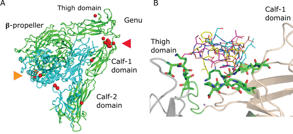 Figure 8: ALOS4 / integrin αvβ3 best twenty docking results. A. The αvβ3 extracellular segment (PDB code 1L5G) is shown using cartoon representation, the αv and β3 chains are colored green and cyan, respectively. The RGD ligand is colored orange and shown using stick representation (marked with orange arrowhead). The best twenty ALOS4 docked position are shown as red spheres each sphere represent the center of the cyclic peptide. Twelve of twenty best results clustered at the interface between the Thigh and Calf-1 domains (marked with red arrowhead). B. Four representative ALOS4 docked peptides at the Thigh (gray) - Calf-1 (wheat) interface are showed using line representation. Two stretches of amino acids form the binding site, D550 – T553 (Thigh domain) and D682 – L693 (Calf-1 domain) are shown as sticks.