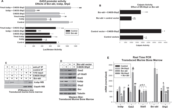 Figure 1: Bcr-abl inhibited Calpain by decreasing Gas2 expression through dephosphorylation of Icsbp by Shp2. A. Activation of Shp2 by Bcr-abl impaired repression of the GAS2 promoter by Icsbp. U937 cells were transfected with a reporter vector with 130 bp of the GAS2 promoter (with an Icsbp-binding cis element). Cells were co-transfected with a Bcr-abl expression vector (or control) with or without vectors to express C463S-Shp2 (dominant negative), Icsbp, or a form of Icsbp with mutation of tyrosine residues in the DNA-binding domain (Ymut-Icsbp). Statistically significant differences indicated by *, **, ***, #, ## or ###. B. Decreased calpain activity in Bcr-abl+ cells was reversed by inhibition of Shp2. Murine bone marrow myeloid progenitor cells were transduced with a retroviral vectors to express Bcr-abl (or control) with or without C463S-Shp2 and assayed for Calpain activity. Statistically significant differences indicated by *, **, or ***. C. Tyrosine phosphorylation of Icsbp was increased by inhibition of Shp2 activity in Bcr-abl+ cells. Cells lysates from the transduced cells described above were immuno-precipitated with an anti-phospho tyrosine antibody (or irrelevant control antibody) and Western blots serially probed with an antibody to Icsbp and Gapdh (to control for loading). D. Inhibition of Shp2 activity in Bcr-abl+ cells decreased Gas2 and Stat5 protein, but increased Icsbp protein. Western blots of lysates from the transduced cells were serially probed with antibodies as indicated. E. Inhibition of Shp2 activity in Bcr-abl+ myeloid progenitor cells decreased Gas2 mRNA, increased Icsbp mRNA, but did not alter Stat5 mRNA. Gene expression in transduced murine bone marrow cells was analyzed by real time PCR. Statistically significant differences indicated by *, **, #, ##, & or &&. For all of these studies, p<0.02 was considered statistically significant.