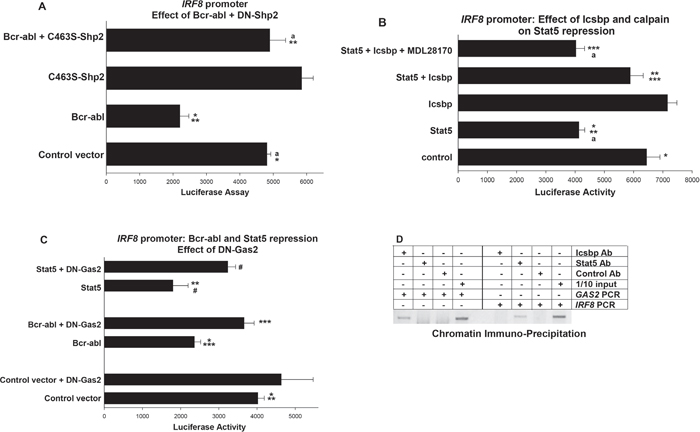 Figure 3: Repression of IRF8 promoter activity by Bcr-abl and Stat5 required inhibition of Calpain by Gas2. U937 cells were transfected with a -984 bp of IRF8 promoter/reporter construct. Transfectants were analyzed for effects of Shp2, Icsbp, Gas2 or Calpain on repression of the IRF8 promoter by Bcr-abl/Stat5. A. Shp2 activity was required for repression of IRF8 promoter activity by Bcr-abl. Cells were co-transfected with vectors to express combinations of Bcr-abl, C463S-Shp2, both, or control vectors. Statistically significant differences indicated by * or **, and not significantly different activity by ‘a’. B. Repression of the IRF8 promoter by Stat5 was impaired by overexpression of Icsbp, but the Icsbp effect was reversed by calpain inhibition. Cells were co-transfected with combinations of vectors to express Stat5 or Icsbp, with or without a calpain inhibitor (MDL28170). Statistically significant differences indicated by *, ** or ***, and not significantly different activity by ‘a’. C. Inhibition of Gas2 impaired repression of the IRF8 promoter by Bcr-abl or Stat5. Cells were co-transfected with vectors to express a dominant negative form of Gas2 (DN-Gas2) and Bcr-abl, Stat5 or control vector. Statistically significant differences indicated by *, **, *** or #. D. Stat5 bound the IRF8 promoter in vivo, but Icsbp did not. Chromatin immuno-precipitation was performed with U937 cells and antibodies to Stat5, Icsbp or irrelevant control. Co-precipitating chromatin was amplified with primers to the IRF8 promoter, GAS2 promoter or IRF8 intron1 (~1.0 kb each). Amplified DNA was separated on an agarose gel and bands visualized by ethidium bromide staining (negative image presented). Irrelevant antibody was a negative control and 1/10 input (non-precipitated) chromatin was a positive control. For all of these studies, p<0.02 was considered statistically significant.