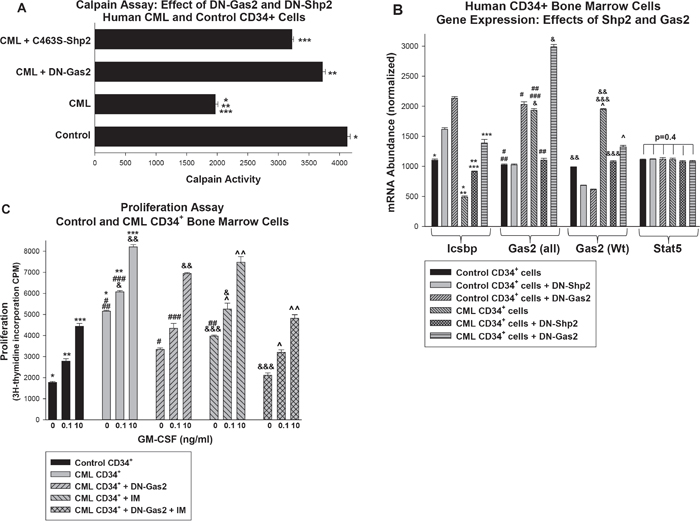 Figure 6. Inhibition of Shp2 or Gas2 increased Calpain activity and Icsbp expression in primary human CD34+ bone marrow cells from CML subjects. Bone marrow CD34+ progenitor cells were isolated from CML or control human subjects. Some cells were transduced with retroviral vectors to express dominant negative forms of Gas2 (DN-Gas2) or Shp2 (C463S-Shp2) (or with control vector). A. Calpain activity was relatively decreased in human CML CD34+ cells versus control, but this was reversed by inhibition of Gas2 or Shp2. Cell lysates were analyzed for Calpain activity. Statistically significant differences indicated by *, ** or ***. B. Inhibition of Gas2 or Shp2 increased Icsbp mRNA in human CD34+ CML cells, but did not alter Stat5 mRNA expression. Cell lysates were analyzed for mRNA expression of Icsbp, Gas2 or Stat5 by real time PCR. These studies used two sets of Gas2 PCR primers; one that did (Gas2-all) and one that did not (Gas2) recognize the dominant negative form. Statistically significant differences indicated by *, **, ***, #, ##, ###, &, &&, &&& or ^. C. Inhibiting Gas2 increased the effect of imatinib on proliferation in CD34+ CML cells. Some cells described above were analyzed for proliferation in response to a dose titration of GM-CSF. Statistically significant differences in by 3H-thymidine incorporation at a given cytokine dose are indicated by *, **, ***, #, ##, ###, &, &&, &&&, ^ or ^^. For all of these studies, p<0.02 was considered statistically significant.