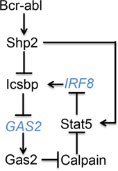 Our studies investigate a novel, Calpain-dependent mechanism resulting in cross regulation between Icsbp and Stat5 in Bcr-abl+ myeloid progenitor cells that promotes leukemogenesis. The goal of these studies is to determine if Icsbp modulates Stat5 activity in CP-CML through Gas2 and Calpain. If Calpain activation both increases Icsbp (a leukemia suppressor) and decreases Stat5 (a leukemia promoter) in CML-LSCs, this might be a rationale therapeutic approach to enhance LSC-targeting during TKI treatment.