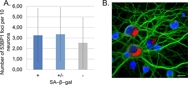 Figure 3: SA-β-gal-positive neurons do not accumulate DSB foci marked by p53BP1 staining. A. Quantitative analysis of the number of p53BP1 foci in SA-β-gal-positive and negative neurons calculated from four cultures. At least 200 neurons were analysed in each group. Values represent the mean ± S.D. SA-β-gal (+): high, (+/-): low, (-): undetectable. B. A representative image of SA-β-gal-positive neurons (red) with no p53BP1 foci detected. A scale bar represents 10 μm.