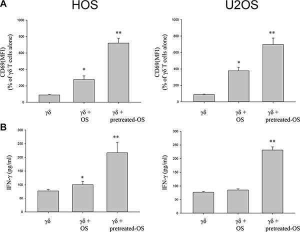 In order to determine whether OS cells pretreated with celastrol could induce activation of γδ T cells, it was assessed by IFNγ production and CD69 expression. Our study reveals that co-culture with OS cells or OS cells pretreated with celastrol induces an enhanced IFNγ production and CD69 expression in γδ T cells in vitro. While the formal demonstration of interactions between γδ T cells and OS cells has yet to be demonstrated, our study highlights a potentially intriguing capacity of OS cells pretreated with celastrol to influence γδ T cell function. The results of this study showed that OS cells pretreated with celastrol are capable of inducing greater numbers of functionally active γδ T cells, implying potentially γδ T cell-mediated cytotoxic effects on OS cells themselves in vitro.