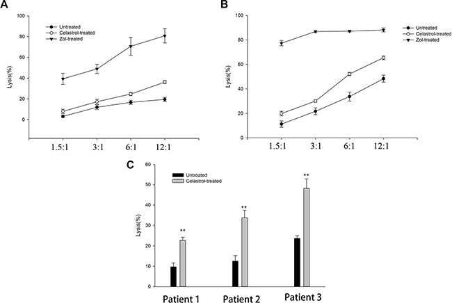 Next, we evaluated the cytotoxic activity of patient-derived γδ T cells against autologous OS tumor cells. γδ T cells from OS patients (n = 3) were selectively expanded, similar to our previous reported data [8]. The results showed that untreated autologous OS cells were poorly sensitive to γδ T cell cytotoxicity. Lyses percentages ranged from (9.7 ± 1.9) % to (23.7 ± 1.3) %, at an E: T ratio of 6:1. But, all these cells showed significantly higher cytotoxicity against autologous OS cells after treatment with Celastrol (Figure 3C).