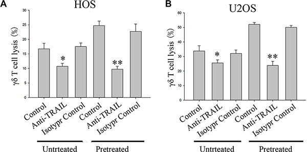 Figure 4: Effect of a neutralizing TRAIL antibody on cytotoxic lysis of OS cells by γδ T cells from healthy donors. HOS (A) and U2OS (B) were incubated with vehicle or 1 μM celastrol for 24 h. Before starting cytotoxicity assay cancer cells were pre-incubated with an TRAIL antibody (1 μg/ml) for 1 h. An isotype control antibody (1 μg/ml) was used as negative control. Values are means ± SEM of n = 4 experiments. *P < 0.05, **P < 0.01; one-way ANOVA plus post hoc Bonferroni test.