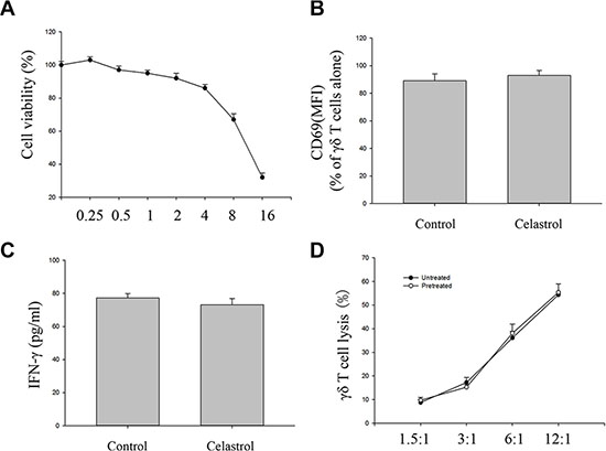 To determine whether celastrol does interfere with γδ T cell function, viability tests were firstly performed by the MTT assay after incubating γδ T cells with various concentrations of celastrol for 24 h. As compared to control group (100% viability), incubation of γδ T cells with less than 4 μM celastrol yielded at least viability rates of 86% ± 2.3% (all values as means ± SEM of n = 4 experiments) (Figure 5A). These findings implied the function of γδ T cells to probably be unaltered by small-dose celastrol. We therefore determined whether co-culture with small-dose celastrol (1 μM) for 24 h could not interfere with the activation and the cytotoxic activity of γδ T cells. The results showed that whereas treatment with 1 μM celastrol for 24 h did not change CD69 expression and IFNγ production of γδ T cells, and the γδ T cell sensitive Daudi cell susceptibility to γδ T cell mediated killing (Figure 5B–5D). Taken together, the results obtained from these experiments revealed no influence of a pretreatment of γδ T cells with small-dose celastrol (1 μM) on γδ T cell-mediated tumor cell lysis, implying the cytotoxic activity of γδ T cells to be unaltered by small-dose celastrol (1 μM).