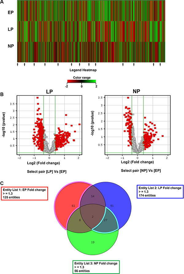 Figure 1: Analysis and comparison of the serum proteome of each group. Using GeneSpring bioinformatics analysis software, (A) the average expression of each protein in each sample group was subjected to hierarchical clustering for early parous (EP), late parous (LP), and nulliparous (NP) subjects. The resulting heatmap indicates proteins that are differentially regulated in the serum of subjects from each group. Red indicates proteins that were downregulated at least two-fold and green indicates proteins that were upregulated at least two-fold. (B) Volcano plots of the data with a fold change cutoff of ≥ 1.3 and a p-value cutoff of ≤ 0.05 were generated. Highlighted in red are proteins that were either downregulated or upregulated in late parous or nulliparous samples with early parous samples serving as the control. (C) Using a fold change cutoff of ≥ 1.3 and a p-value cutoff of ≤ 0.05, a Venn diagram was constructed to find differentially regulated proteins of interest, namely those proteins differentially expressed only in EP samples (61 proteins) and those differentially coexpressed in LP and NP samples (27 proteins).