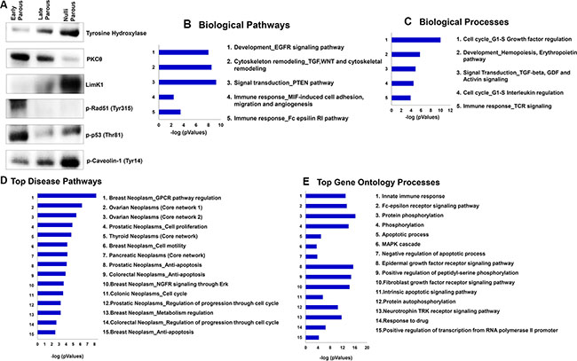 Figure 3: Confirmation of proteomic changes using Western blot and MetaCore knowledge-based bioinformatics analysis of the late/nulliparous serum proteome. (A) Western blot analysis of total Tyrosine Hydroxylase, PKCθ, LimK1 and phosphorylated p-Rad51 (Tyr315), p-p53 (Thr81), and p-Caveolin1 (Tyr 14) in early parous (EP), late parous (LP), and nulliparous (NP) serum samples show a similar trend as that expressed in the protein array. (B and C) Top five biological pathways and top five biological processes in late and nulliparous women compared to early parous women. Functional and gene ontology enrichment analysis and network analysis was carried out to assess biological functions associated with protein profiles that likely play a role in parity-induced protection against breast cancer. (D) Top fifteen disease pathways according to known biomarkers in LP and NP women compared to EP women. (E) Top fifteen GO (gene ontology) processes in LP and NP women compared to Bar length is a reflection of significance and represents the negative logarithm of the enrichment p-value determined by MetaCore pathway enrichment analysis.