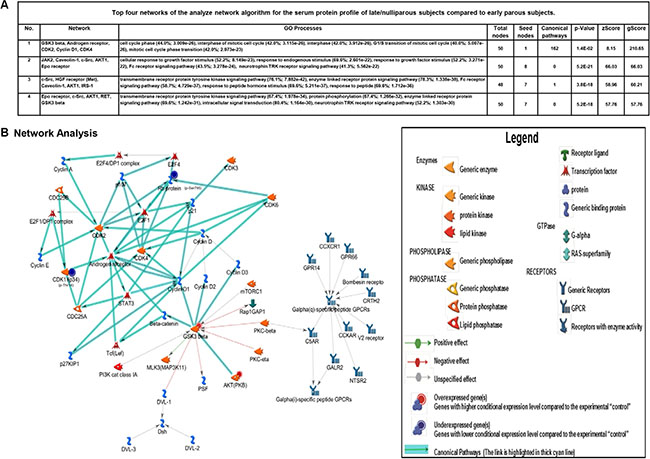 Figure 4: Bioinformatics analysis of altered networks in late/nulliparous serum proteome. (A and B) Top four networks of the analyze network algorithm for the serum protein profile of late/nulliparous subjects compared to early parous subjects. Top scoring network of the analyze network algorithm of late and nulliparous serum protein profiles. Directional edges are marked with arrows that are either green (activation) or red (inhibition). Arrows highlighted in teal blue define the presence of canonical pathways with well-established signaling pathways.