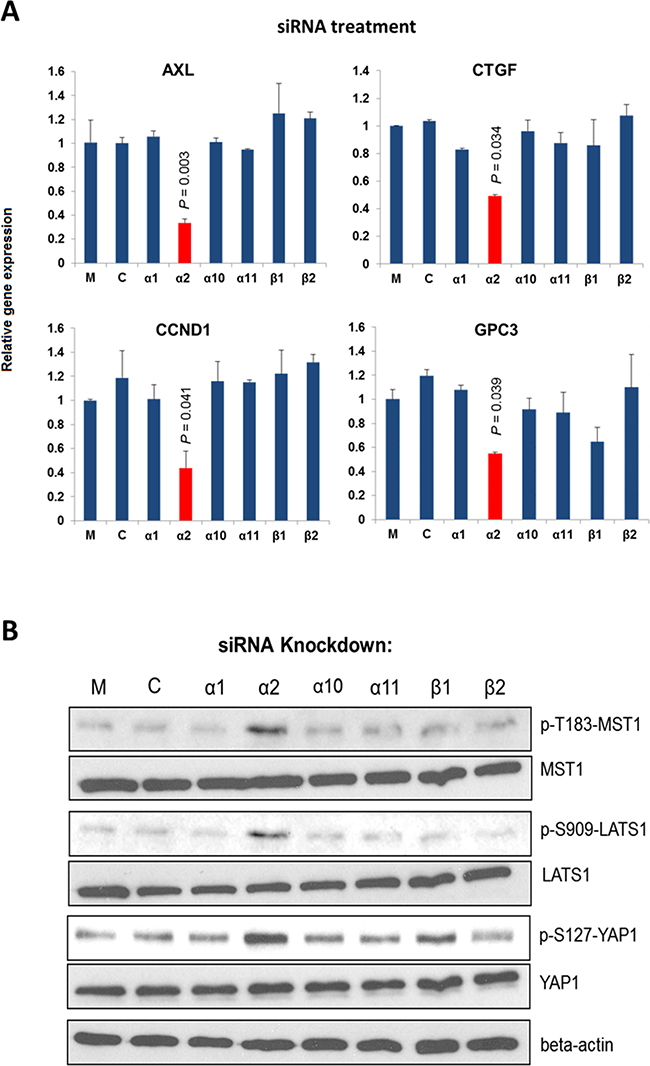 Figure 1. Integrin α2 is important for the expression of YAP targeted genes. A. Knockdown of ITGA2 in PLC cells suppressed significantly the expression of four YAP targeted genes (AXL, CCND1, CTGF, and GPC3) comparing with the mock-treated groups. B. Knockdown of ITGA2 caused substantial increases in the phosphorylation at T183, S909, and S127 of MST1, LATS1, and YAP, respectively comparing with the groups treated with transfection reagent alone (M) and scrambled siRNA (C). All data shown are the representative of three independent experiments.