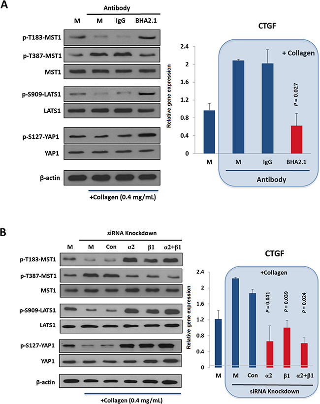 Figure 2. Extracellular matrix adhesion by α2β1 integrin adhesion inhibits the Hippo pathway. A. Adhesion of Huh7 cells to collagen IV reduced the stimulatory p-T183-MST1 and p-S909-LATS1 but increased the inhibitory p-T387-MST1, leading to a decrease in p-S127-YAP and in turn YAP-mediated CTGF expressions (right panel). Treatment of the cells with an integrin function-blocking antibody (BHA2.1), but not PBS (M) and control IgG (IgG) antagonized the effect of collagen binding on Hippo pathway. B. Knockdown of ITGA2 (α2) and ITGB1 (β1) by siRNAs reversed the effect of collagen binding on Hippo pathway components, causing a significant reduction on CTGF expression comparing to the mock-treated group. All data shown are the representative of three independent experiments.
