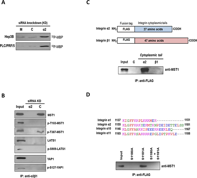 Figure 3. MST1 is an immediate downstream target of integrin α2. A. Endogenous MST1 was immunoprecipitated from Hep3B and PLC cells treated with control siRNA (C) or siRNA targeting ITGA2 (α2) and subjected to in vitro kinase assay using myelin basic protein (MBP) as a substrate. Incorporation of radioactive 32P into MBP was higher in the siRNA-ITGA2 treated group comparing to mock and control siRNA-treated group. B. In scrambled control siRNA-treated Hep3B cells (C) α2β1 integrin was co-precipitated with MST1 and p-T387-MST1 but not p-T183-MST1. No co-precipitation was observed with YAP and LATS1 proteins. Cell lysate obtained from siRNA-ITGA2-treated Hep3B cells (α2) was also included as a negative control. C. The cytoplasmic tails of integrin α2 and β1 were cloned, and individually over-expressed in 293T cells as FLAG-tagged proteins (top). Endogenous MST1 could be pulled down with the cytoplasmic tail of integrin α2 but not β1 by the anti-FLAG affinity resin (bottom). D. Multiple sequence alignment showed integrin α2 differs from α1, α10, and α11 at its carboxyl end with two additional serine residues S1180 and S1181 (top). Integrin α2 cytoplasmic tail mutants with single mutation (i.e. S1180A or S1181A) and double mutations (i.e. S1180A + S1101A) were over-expressed in 293T cells as FLAG-tagged proteins. Endogenous MST1 was not pulled down with the FLAG-tagged protein with S1180A mutation by the anti-FLAG affinity resin (bottom). All data shown are the representative set of two independent experiments.