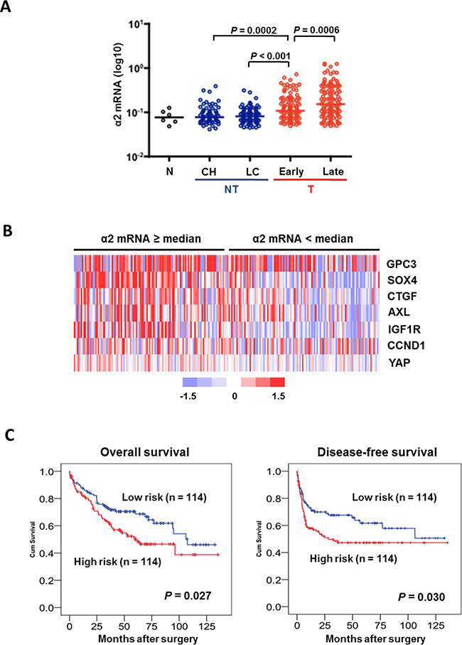 Figure 5. An integrin α2-activated YAP oncogenic signature predicts prognostic outcomes in HCC patients. A. Analysis of transcriptome data of 228 HCC patients showed ITGA2 expression was elevated in HCC tumors comparing to non-neoplastic lesions like chronic hepatitis (CH) and liver cirrhosis (LC). ITGA2 expression in late-stage tumor was also higher than in the early staged. B. Expression of a set of YAP-targeted genes (AXL, CCND1, CTGF, GPC3, IGF1R, and SOX4) was found higher in patients over-expressing integrin α2 (i.e. mRNA ≥ medium), comparing to patients with integrin α2 expression < medium. Red, over-expression; blue, under-expression; white, no changes. C. Kaplan-Meier analysis illustrated the significant difference in overall (P = 0.027) and disease-free (P = 0.03) survivals between patients with high (≥ medium) and low (< medium) co-expression of ITGA2 and YAP-targeted gene set.