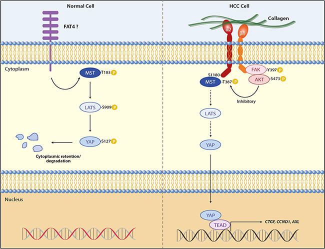 Cell-extracellular matrix interaction shows substantial impacts on cell fate because it is one of the major mechanical cues to regulate organ development and homeostasis [39, 40], and on the other hand, its pathological perturbations contribute to malignant progression by inducing cytoskeleton remodeling [41]. YAP and TAZ, the transcriptional co-activators regulated by the Hippo pathway, have been identified as effectors in response to ECM elasticity and cell shape, of which the mechanism involves the control of both co-activators by F-actin and stress fiber [20, 21, 42]. Mechanosensitive phenotypes can also be regulated by integrins and their association with YAP/TAZ. For example, the integrin-linked kinase (ILK) induced YAP/TAZ nuclear localization through suppression of the Hippo pathway via phospho-inhibition of MYPT1-PP1 and inactivation of Merlin [43]. Stiff substrates enhanced colorectal cancer cell viability by upregulating MMP-7 expression through a positive feedback loop containing YAP, EGFR, integrin-α2β1 and MRLC, independent of Hippo pathway [25]. α2β1 integrin can directly interact with CDH17 through its RGD motif [44], which causes β1 integrin activation and signaling to induce focal adhesion kinase and Ras activation, leading to colorectal cancer cells proliferation and liver metastasis [28]. Despite these important findings, the cell-surface components upstream the Hippo pathway and that sense the pathway to extracellular stimuli, especially in the context of pathogenesis like carcinogenesis, have remained to be elucidated. To address this unresolved question, the present work demonstrates that the binding of α2β1 integrin to collagen IV, which is the ECM that is highly accumulated in tumor interstitium [45, 46], inhibits the Hippo core kinases MST1 and LATS1, liberating YAP for its transactivation of gene expression in the nucleus (Figure 6). Our transcriptome analysis on HCC patients shows a stepwise increase in ITGA2 expression along the hepatocellular carcinogenic process, and patients co-expressing ITGA2 and YAP-targeted genes including AXL, CCND1, CTGF, GPC3, IGF1R, SOX4, were found to show more dismal prognosis after hepatic surgery. Thus, it is believed that HCC cells adherent to ECM collagen in tumor microenvironment capitalize α2β1 integrin to modulate the Hippo tumor suppressor functions thereby overcoming the general physiology of contact-contact inhibition.