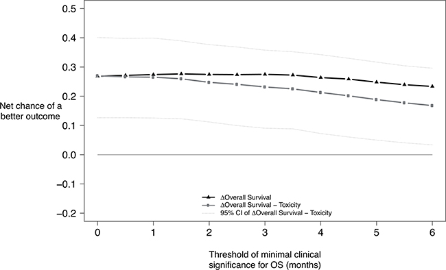 Figure 1: Benefit-risk of FOLFIRINOX according to the minimum survival benefit considered clinically significant. Net chance of a better outcome with FOLFIRINOX according to the minimum survival benefit considered clinically meaningful. First priority outcome: Overall survival. Second priority outcome: Worst grade of at least possibly related adverse events. Solid black line with asterisks : Net chance of a better survival with. Solid light-grey line with points : Nat chance of a better overall outcome with FOLFIRINOX.