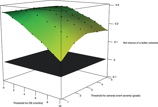 Figure 2: Benefit-risk of FOLFIRINOX according to the survival threshold of clinical significance and to the adverse event severity threshold (in number of adverse event grades). Net chance of a better overall outcome with FOLFIRINOX according to the minimum survival benefit considered clinically significant and to the minimal difference in adverse event grade considered clinically significant. First priority outcome: Overall survival. Second priority outcome: Worst grade of at least possibly related adverse events. In green, the net chance of a better overall outcome is strongly in favor of FOLFIRINOX. In yellow the net chance of a better overall outcome is mildly in favor of FOLFIRINOX. The plane in black indicates no treatment benefit.