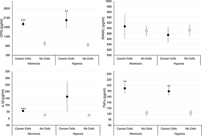 Figure 4: Protein releases (ELISA), expressed as total protein ratio (n = 3 replicates), in male bone fragments cultured with or without PC-3 cancer cells, both in normoxic and hypoxic conditions. OPG (normoxia: ***p < 0.0005; hypoxia: **p < 0.005), TNF-α (normoxia and hypoxia: **p < 0.005), IL-1β (normoxia: ***p < 0.0005): bone fragments with PC-3 versus bone fragments without cancer cells.