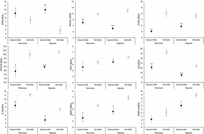 Figure 5: Gene expression analysis (n = 3 replicates) in female bone fragments cultured with or without MCF-7 cancer cells, both in normoxic and hypoxic conditions. RANKL (normoxia: **p < 0.005; hypoxia: ***p < 0.0005), CTKS (normoxia and hypoxia: **p < 0.0005), PTH1R (normoxia: *p < 0.05; hypoxia: ***p < 0.0005), IL-6 (normoxia: **p < 0.005; hypoxia: ***p < 0.0005), IL-1β (normoxia: **p < 0.005; hypoxia: *p < 0.05), MMP-1 (normoxia and hypoxia: *p < 0.05), SPI1 (hypoxia: *p < 0.05) and MMP-13 (hypoxia: *p < 0.05): bone fragments with MCF-7 versus bone fragments without cancer cells. OPG (normoxia: *p < 0.05; hypoxia: **p < 0.005): bone fragments without cancer cells versus bone fragments with MCF-7.