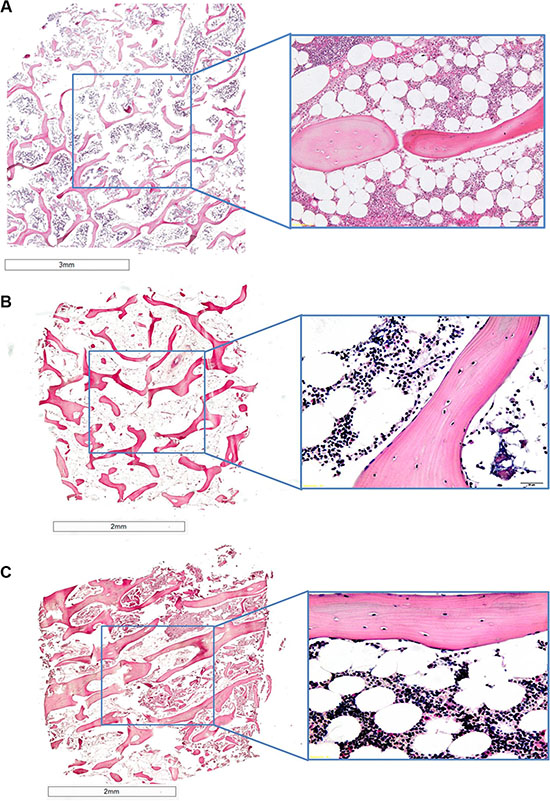 Figure 7: H/ E stained sections of human bones grown in the absence of cancer cells at (A) T0 and (B) and (C) at T1, (B) in normoxic conditions and (C) hypoxic conditions.1.25× and 40× of magnification.