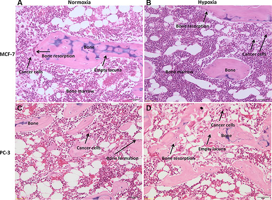 Figure 8: H/ E stained sections of human bone femoral head specimens grown in the presence of human cancer cells, both MCF-7 or PC-3, under normoxic and hypoxic conditions. (A and B) Human bone from females patients cultured in the presence of MCF-7 breast cancer cell lines under (A) normoxic and (B) hypoxic conditions. (C and D) Human bone from males patients cultured in the presence of PC-3 prostate cancer cell lines under (C) normoxic and (D) hypoxic conditions. All sections are at 40× magnification.