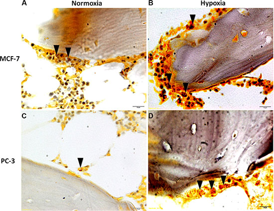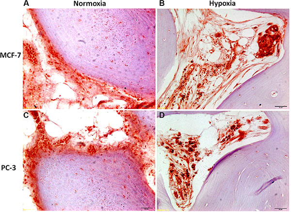 Post co-culture immunohistochemical staining with anticytokeratin 8 and 18 antibody of bone specimens with MCF-7 or PC-3, under normoxic and hypoxic conditions at 7 days, confirmed the histological results showing infiltration of tumor cells into the marrow compartment, predominantly in hypoxic condition, (Figure 9) and onto ossified bone surfaces.