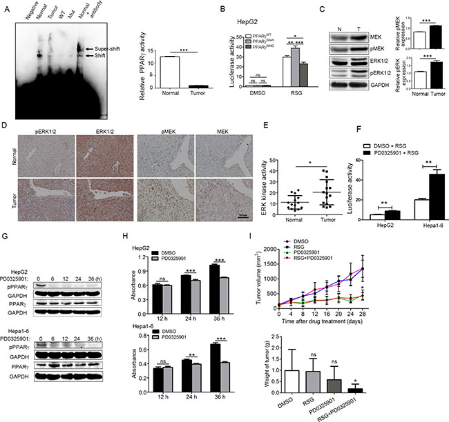 Figure 2: Phosphorylation of PPARγ up-regulated by MEK/ERK kinase increases the proliferation of HCC. (A) PPARγ transcriptional activity in normal liver and hepatocyte carcinoma measured by EMSA; Normal, Normal liver tissue; tumour, tumour liver tissue; Negative, without oligonucleotides control; Mut, Biotin end-Labeled mutant; WT, cold competitor. (B) PPARγ transcriptional activity in hepG2 cell overexpressing PPARγWT, PPARγSA and PPARγSD measured by luciferase reporter with/without RSG. (C) Phosphorylation level of ERK and MEK in tumour and normal liver tissue by western blot. (D) Phosphorylation level of ERK and MEK in tumour and normal liver tissue by immunostaining. (E) ERK kinase activity in tumour and normal liver tissue is measured by ERK kinase activity kits. (F) PPARγ transcriptional activity was measured in HepG2 and Hepa1-6 treated with PD0325901 for 12 hrs using luciferase reporter gene assay. (G) the expression of p-PPARγ and PPARγ in HepG2 and Hepa1-6 treated with PD325901 for 0, 6, 12, 24, and 36 hrs separately. (H) Proliferation of HepG2 and Hepa1-6 treated with or without PD0325901. (I) Tumour growth curve of mice treated with DMSO, RSG only, PD0325901 only, or RGS+ PD0325901.