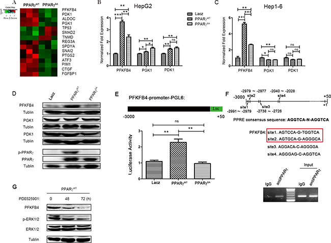 Figure 4: PFKFB4 is a target gene of PPARγ gene-expression data from HepG2 cells transfected with PPARγWT or PPARγSA. (A) Each row represents an individual gene, and each column represents a transfected HepG2 cell sample. In the matrix, red and green reflect relatively high and low expression levels of genes, respectively, as indicated in the scale bar (a log2-transformed scale). (B and C) qRT-PCR experiments with mRNAs from the indicated cancer cell lines after transfection with lacZ, PPARγWT or PPARγSA. (D) Western blotting analysis of the three glycolysis enzymes, p-PPARγ & PPARγ in HepG2 cells transfected with indicated plasmid. (E) A pGL3 luciferase reporter plasmid was constructed with the promoter of PFKFB4.The activity of PFKFB4 promoter was detected by luciferase reporter from HepG2 cells transfected with lacZ, PPARγWT or PPARγSA. (F) Prediction by PPRE research, four sequences in the human PFKFB4 promoter (–3000~+50) displayed significant homology with the PPARγ recognition motif. HepG2 were harvested for ChIP analysis with an anti-PPARγ antibody or preimmune IgG using site1 and site2 chip primers. Input chromatin was diluted to 1:1000. All PCR products were resolved by 2% agarose electrophoresis. (G) Western blotting analysis of phosphorylation level of ERK and PFKFB4 expression in PPARγWT (HepG2) cell line treated with PD325901 for 0, 48 and 72 hrs separately. (*P < 0.05; **P < 0.01; ***P < 0.005; by Student t test).