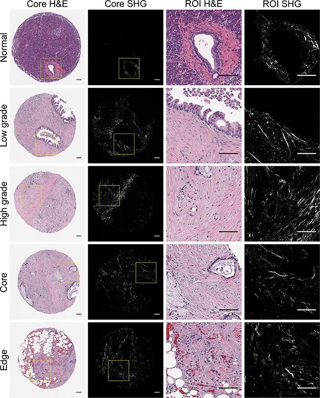 Figure 1: Representative pancreatic tissues visualized with H&E staining and SHG microscopy. H&E stained tissues cores representing normal and distinct PDAC regions (low grade, high grade, tumor core, infilitrating edge) were visualized holistically with SHG stitching. For each core, 1-2 pathology-confirmed regions of interest (ROIs) containing malignant cells and associated stroma were marked to omit stroma associated with non-malignant tissue components. Yellow boxes indicate representative ROI regions that were extracted from whole TMA cores and subsequently quantified for collagen alignment.