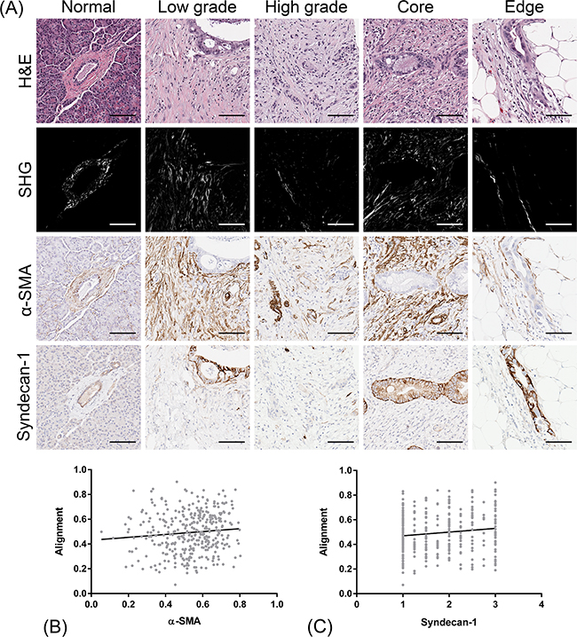 Fibrillar collagen is strongly implicated in PDAC progression due its remarkable abundance throughout the stroma [57,58]. We have recently shown that the PDAC-associated stroma is not only rich in fibrillar collagen amount, but also that collagen is reorganized and more aligned compared to that in benign pancreatic stroma [59]. The purpose of this study was to determine if the level of stromal collagen alignment can provide a quantifiable PDAC disease marker that correlates with patient prognosis following surgical resection. To do this, we specifically imaged fibrillar collagen in the stroma adjacent to the malignant epithelium in clinical histopathology specimens with SHG microscopy and quantified alignment using established fiber tracking algorithms. Furthermore, we mapped and evaluated the expression of the epithelial-to-mesenchymal (EMT) phenotype and established stromal cell markers (α-SMA, syndecan-1) to the same malignant regions to shed light on potential relationships between important components of the PDAC microenvironment.