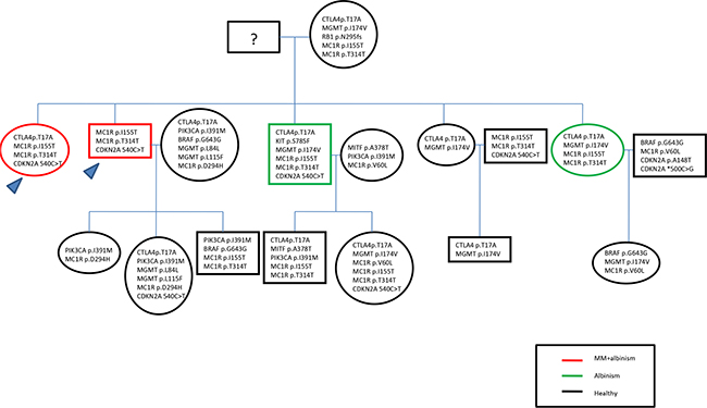 In conclusion, given that the indexes affected by MPM did not carry MGMT p.Ile174Val,and in the light of its neutral role, we hypothesized that the haplotype found in healthy siblings could have a protective role. Moreover, our findings highlighted a possible involvement of MC1R in the occurrence of albinism. The second generation offspring is under strict follow up as some of them have a higher risk of developing multiple primary melanoma according to our model.