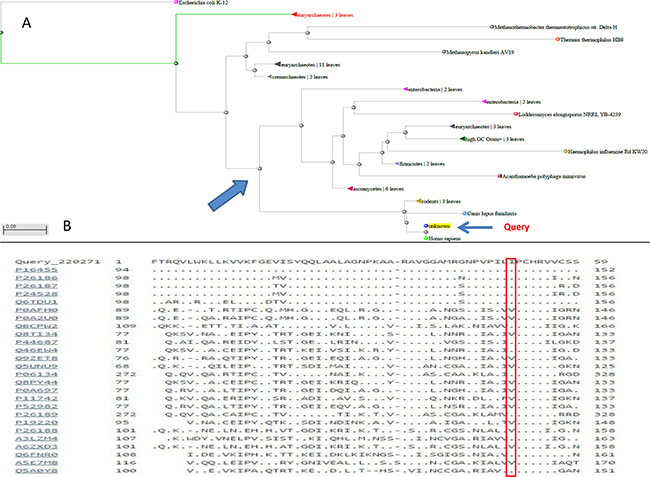 Figure 2: A. Dendrogram of the phylogenetic analysis from which the principal node was extracted to show B. the alignment of the protein sequences of the most similar species.