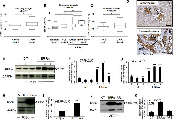 Figure 1: ERRα expression and CRPC from PCa patients. (A) Meta-analysis using public datasets showed that ERRα mRNA expression is higher in CRPC patients in GSE6919 (Student’s t-test P = 0.0172). (B) ERRα was also found to be higher in CRPC compared to androgen-sensitive PCa, as well as in primary tumors from CRPC patients that developed metastases to bone compared to other sites or normal prostate tissues in GSE21034 (One way ANOVA, bonferri post-hoc test : P < 0,05, normal (n = 22) versus CRPC (n = 41); P < 0.0005, normal (n = 22) versus CRPC bone mets (n = 5); P < 0.005, PCa (n = 104) versus CRPC bone mets (n = 5)) and (C) PCa versus CRPC (that all had developed bone metastases) in GSE32269 (Student’s t-test P = 0.0178): *P < 0.05, **P < 0.005, ***P < 0.0005. (D) Visualization of ERRα protein expression by IHC on sections of prostate primary tumor (a) and the associated bone metastatic lesions (b) from the same patient. (E) Assessment of ERRα expression by Western blotting and (F) real-time RT-PCR on triplicate samples and normalized against the ribosomal protein gene L32 (ANOVA, Student’s t-tests P < 0.0001) in PC3 control (CT-1-3) and PC3-ERRα (ERRα-1–3) overexpressing ERRα clones. (G) Increased expression of VEGF-A mRNA in PC3-ERRα (ANOVA, Student’s t-tests P < 0.0001). (H) Increase of ERRα protein expression in PC3c-ERRα (ERRα(c)) overexpressing ERRα shown by Western blot and (I) by real-time RT-PCR for VEGF-A expression (Student’s t-tests P = 0.001). (J) Assessment of ERRα expression by Western blotting in an ACE-1 empty-vector CT clone, an ACE-ERRα and a clone overexpressing the dominant negative ERRα with AF2 domain deletion (AF2). (K) VEGF-A mRNA expression was also increased in ACE-ERRα cells (Student’s t-tests P = 0.0001). Bar = 200 μm, T: Tumor; Ost: osteocytes; BM: Bone Matrix