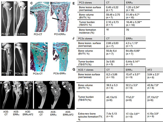 To address ERRα function in PCa bone progression, we used three CRPC pre-clinical models, two human models (PC3 and PC3c) and one canine model (ACE-1). Specifically, a full-length ERRα cDNA was stably transfected into PC3 cells, which are known for their capacity to form osteolytic lesions in vivo [27]. Three independent PC3-ERRα clones (overexpressing ERRα) and three PC3-CT clones (harboring empty vector) were generated (Figure 1E, 1F). In parallel, to validate further the human PC3 model, human PC3c and canine ACE-1 PCa cells that both induce mixed bone lesions (with both osteolysis and osteoformation) were stably transfected with full-length ERRα cDNA (Figure 1H, 1J) [28] [29]. ACE-1 cells were also transfected with cDNA containing a truncated form of ERRα lacking the co-activator binding domain AF2 (AF2) (Figure 1J) [22]. Western blotting confirmed higher ERRα expression in PC3-ERRα, PC3c-ERRα and ACE-1-ERRα than in their respective control cells (Figure 1E, 1H, 1J). The presence of a slightly lower molecular weight band in AF2 in ACE-1 cells expressing the ERRα-AF2 deletion mutant corresponded well with its expected smaller size (AF2; Figure 1J) [22]. As expected, expression of mRNA for VEGF-A, a known ERRα target gene [30] was higher in all of the ERRα overexpressing clones (ERRα; PC3, PC3c and ACE-1) but not in the AF2 ACE-1 clone, confirming the increased activity and the dominant negative functions of both wild-type ERRα and the truncated ERRα-AF2 constructs respectively (Figure 1G, 1I, 1K). To assess whether and how levels of ERRα in tumor cells affected progression of bone lesions, PC3, PC3c and ACE-1 clones were inoculated via intra-tibial injections into SCID male mice (Figure 2). Three weeks (for PC3 (pool of the 3 clones for CT and ERRα respectively) and ACE-1 clones) (Figure 2 (PC3 (A–E), ACE-1 (K–Q)) and six weeks (for PC3c clones) (Figure 2 PC3c (F–J)) after tumor cell injections, radiographs revealed that animals bearing ERRα overexpressing tumors had increased bone lesion surfaces whereas ACE-AF2 tumors had decreased bone lesion surface compared to CT tumors (Figure 2 -PC3 (A–B), (Mann-Whitney, P = 0.011) (bone lesion surface mm2)(E), -PC3c (F-G), (Mann-Whitney, P = 0.0175)(J) -ACE-1 (K–M) (Mann-Whitney, P = 0.0079, P = 0.0304) (Q)). The stimulatory effect of ERRα on PCa-induced bone lesion surface was confirmed by three-dimensional micro-computed tomographic reconstruction (%BV/TV) (cortical and trabecular bone), with a decrease in bone volume in animals bearing PC3-ERRα and ACE-1-ERRα tumors (%BV/TV, Mann-Whitney, PC3 P = 0.022 and, ACE-1 P = 0.0411) suggesting an increase in bone destruction in both ERRα overexpression models (Figure 2E and 2Q, %BV/TV). The stimulatory effect of ERRα on PCa-induced bone lesion surface was also evident by histology (Figure 2 PC3(C,D)) and histomorphometric analysis (TB/STV) with an increase of skeletal tumor burden (Figure 2E and 2Q). Since the osteoblastic region is highly stimulated in the PC3c model (Figure 2H, 2I) (see the increased of the %BV/TV: (Mann-Whitney, P = 0.022)), the surface of the tumor (TB/STV) decreased in animals bearing PC3c-ERRα (Figure 2J (Mann-Whitney, P = 0.0023)) (asterisks showing bone formation). Similarly, 70% of mice bearing PC3-ERRα tumors exhibited small new bone formation compared to mice bearing PC3-CT tumors (Figure 2E). New bone formation was also seen in animals bearing ACE-1-ERRα versus ACE-1-CT tumors (Figure 2Q: extra-bone-new spicules surface formation/ tissue volume; Figure 2 (N-P) (asterisks mark extra-new spicules bone formation). The bone lesion surface and bone volume-new bone formation effects seen with ERRα overexpression were markedly abrogated in tumors bearing the dominant negative AF2-truncated ERRα (Figure 2K, 2M and 2N, 2P, 2Q). Taken together, our results indicate that overexpression of ERRα in PCa cells stimulates both new bone formation and destruction suggesting that it may be associated with mechanisms mediating mixed lesions in vivo.