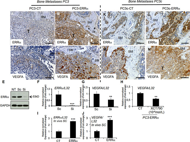 Figure 5: Stimulation of VEGF-A expression in PCa cells by ERRα. (A–B) Visualization of the overexpression of ERRα protein expression in tumor by IHC on bone lesions in vivo induced by PC3-ERRα (ERRα)(B) compared PC3-CT (CT)(A). (C–D) Paralleling the overexpression of ERRα, VEGF-A expression in tumor was also stimulated in vivo in bone lesions induced by PC3-ERRα (ERRα) (D) compared PC3-CT (CT) cells (C). (E) Decreased ERRα protein expression by transfection of three pooled siRNA sequences in parental PC3 cells shown by Western blot and (F–G) by real-time RT-PCR for ERRα and VEGF-A expression (Student’s t-tests P = 0.0002; P = 0.0027). (H) Decreased VEGF-A mRNA expression was also observed after XCT-790 treatment at 10−6M for 48 h in PC3-ERRα cells (Student’s t-tests P = 0.006). (I–J) Real-time RT-PCR was performed on triplicate samples and normalized against the ribosomal protein gene L32 to evaluate ERRα (P = 0.0001) and VEGF-A (P = 0.0001) expression within subcutaneous (SC) tumors in vivo (pool of n = 3 for each condition). (K–N) Similarly, to the PC3 model, IHC revealed that ERRα and VEGF-A protein levels in tumors were increased in mixed lesions induced by PC3c-ERRα (ERRα) (L and N concomitantly) compared to PC3c-CT (CT) (K and M concomitantly) in vivo. Bar = 200 μm, T: Tumor; OB: osteoblasts; BM: Bone Matrix.