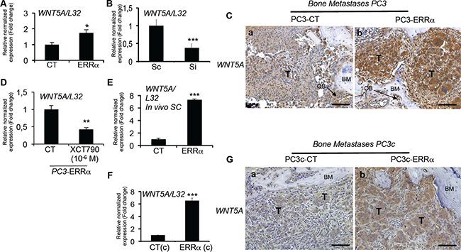 Figure 6: Stimulation of WNT5A expression in PCa cells by ERRα. (A) Assessment of WNT5A expression by real-time RT-PCR on triplicate samples and normalized against the ribosomal protein gene L32. WNT5A (Student’s t-tests P = 0.0305) was higher in PC3-ERRα versus PC3-CT (CT) cells in vitro. (B) WNT5A (Student’s t-tests P= 0.0007) mRNA expression was decreased in Si-ERRα (pooled of three SiRNA sequences) transfected cells compared to control-transfected (Sc) cells. (C) Paralleling the overexpression of ERRα, WNT5A protein level expression was also stimulated in tumor in vivo in bone lesions induced by PC3-ERRα (ERRα)(b) compared PC3-CT (CT) cells (a). (D) Decreased WNT5A mRNA expression was also observed after XCT-790 treatment at 10-6M for 48 h in PC3-ERRα cells (Student’s t-tests P = 0.0077). (E) By real-time RT-PCR, we also found WNT5A mRNA expression (Student’s t-tests P = 0.0001) increased in PC3-ERRα SC tumors in vivo compared to PC3-CT SC tumors (F) WNT5A (Student’s t-tests P = 0.0026) mRNA expression was also upregulated in the PC3c-ERRα ((ERRα(c)) clone compared to the PC3c-CT (CT(c)) in vitro and (G) in tumor in vivo in bone lesions induced by PC3c-ERRα (ERRα)(b) compared PC3c-CT (CT) cells (a). Bar = 200 μm, T: Tumor; OB: osteoblasts; BM: Bone Matrix.