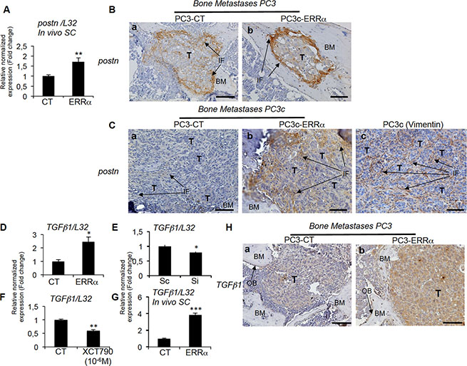 Figure 7: Regulation of stromal postn by ERRα. (A) Assessment of the mouse postn expression by real-time RT-PCR on triplicate samples and normalized against the mouse ribosomal protein gene L32. Real-time RT-PCR showed increased postn mRNA expression (Student’s t-tests P = 0.0026) in PC3-ERRα-induced SC tumors in vivo. (B) Increased expression of postn in peri-tumoral and infiltrating fibroblasts was visualized by IHC on PC3-ERRα-induced bone lesions (b) compared to PC3-CT (a). (C) Similarly, postn protein was upregulated in the infiltrating fibroblasts in vivo in bone lesions induced by PC3c-ERRα (ERRα)(b) compared PC3c-CT (CT) cells (a). Vimentin antibody was used to show the fibroblastic type of the postn expressing cells (c) (D) Real-time RT-PCR showed that TGFb1 mRNA expression (Student’s t-tests P = 0.0246) was higher in PC3-ERRα versus PC3-CT (CT) cells in vitro while (E) TGFb1 (Student’s t-tests P = 0.022) mRNA expression was decreased in Si-ERRα (pooled of three sequences) transfected cells compared to control-transfected (Sc) cells. (F) Real-time RT-PCR also showed decreased TGFb1 mRNA expression (Student’s t-tests P = 0.0033) in XCT790 treated PC3-ERRα cells and (G) increased TGFb1 mRNA expression (Student’s t-tests P = 0.0002) in PC3-ERRα-induced SC tumors in vivo. (H) TGFb1 staining was higher in PC3-ERRα (b) compared to PC3-CT (a) in tumor-induced bone lesions in vivo. Bar = 200 μm. T: Tumor; OB: osteoblasts; BM: Bone Matrix; IF: infiltrating fibroblasts.