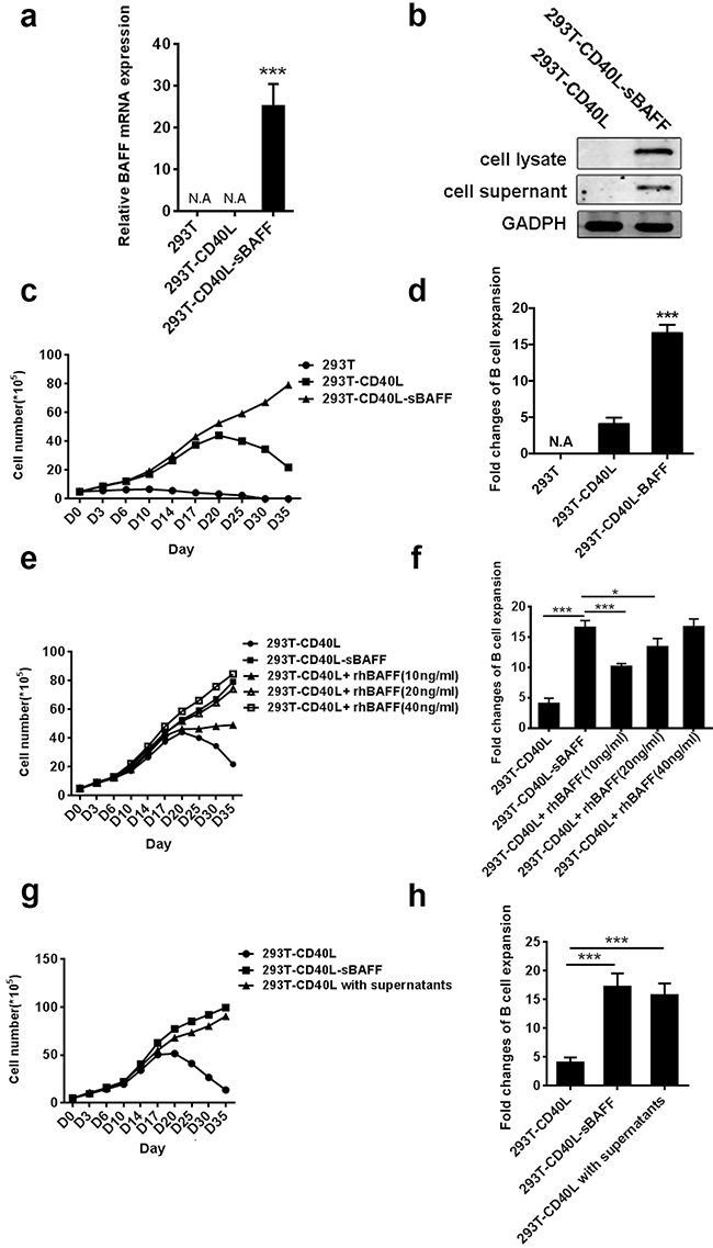 Figure 1: The 293T-CD40L-sBAFF cell line had the better potential to stimulate B cell growth. a. BAFF mRNA expression was confirmed by quantitative RT-PCR. b. Western-blotting confirmed the presence of Flag-tagged soluble BAFF in the cell lysate and the supernatant. c-h. B cells from multiple healthy adult donors were co-cultured with the irradiated 293T, 293T-CD40L or 293T-CD40L-sBAFF feeder cells in the presence of cytokine cocktails as well as the indicated treatments. The B cells were harvested every 3-5 days and the cell numbers excluding trypan blue-positive dead cells were counted, with the average measurements for three donors and their standard deviations over time are shown. (c) Expansion patterns and (d) The B-cell expansion change in the presence of 293T-CD40L-sBAFF cells, 293T-CD40L cells, or 293T cells at day 35. (e) Expansion patterns and (f) expansion fold change of B-cells in the presence of 293T-CD40L-sBAFF cells, or 293T-CD40L cells with varying concentrations of recombinant human BAFF (rhBAFF) at day 35. (g) Expansion patterns and (h) expansion fold change of CD40L-B cells with the filtered supernatants of 293T-CD40L-sBAFF cells at day 35. Data represent mean ± SD (error bars) for a representative experiment of n = 3 independent experiments. The paired t-test and one-way ANOVA were used. P < 0.05 indicates statistically significance difference. * indicates P < 0.05; ** indicates P < 0.01; *** indicates P < 0.001.