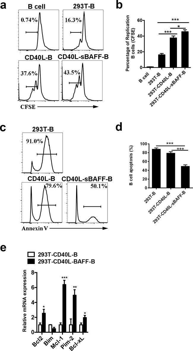 Figure 2: The 293T-CD40L-sBAFF cell line had the capacity to induce B cell growth and prevent apoptosis. a, b. Cell division of 293T-B cells, CD40L-B cells and CD40L-sBAFF-B cells were measured by CFSE dilution with flow cytometry analysis, in comparison with non-activated cells (B cells) on day 7 after co-culture with feeder cells. c, d. Cell apoptosis of 293T-B cells, CD40L-B cells and CD40L-sBAFF-B cells were measured by Annexin V staining by flow cytometry on day 20 after co-culture with feeder cells. e. The mRNA expression of pro-apototic and anti-apoptotic factors in B cells. Data represent mean ± SD (error bars) for a representative experiment of 4 independent experiments with 4 healthy donors. The paired t-test and one-way ANOVA were used. P < 0.05 indicates statistically significance difference. * indicates P < 0.05; ** indicates P < 0.01; *** indicates P < 0.001.
