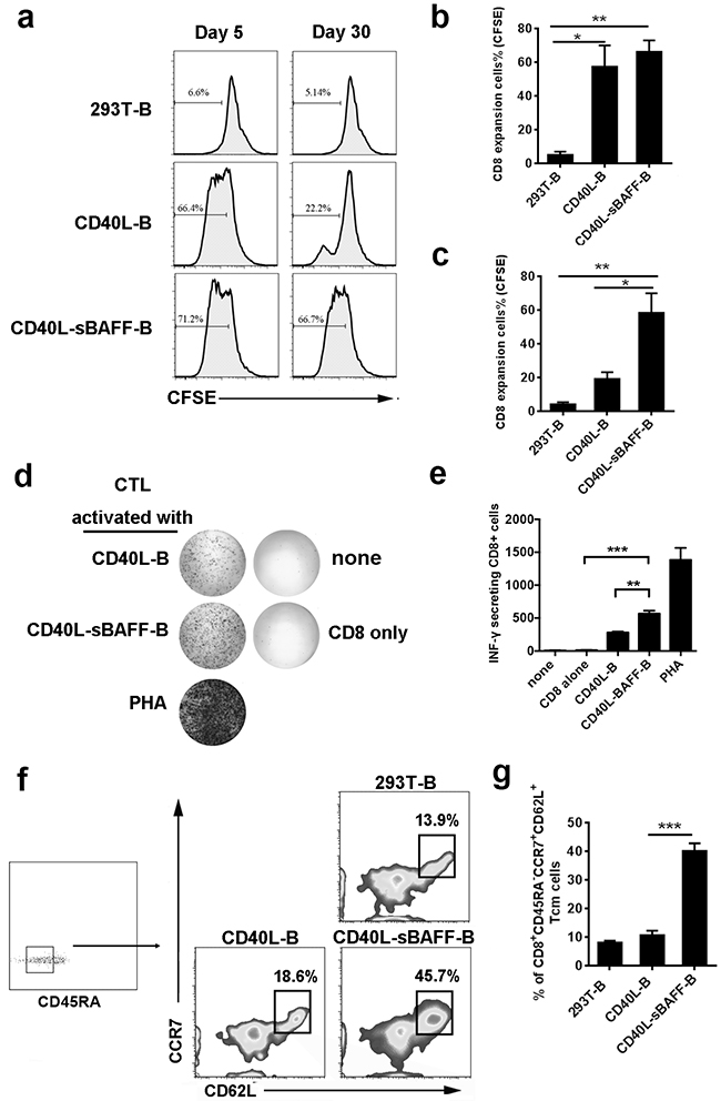Figure 4: CD40L-sBAFF-B cells were of enhanced antigen-presentation capacities. On day 5 and day 30 after co-culturing, 293T-B cells, CD40L-B cells and CD40L-sBAFF-B cells were harvested. a-c. B cells were co-cultured at an optimal ratio of 3:1 with CFSE-stained autologous CD8+ T cells. Cell divisions of CD8+ T cells were measured by CFSE dilution. d-g. B lymphocytes were cultured for 30 days, and then harvested, irradiated, washed, and co-cultured with purified autologous CFSE-labeled CD8+ T lymphocytes at an E: T ratio of 1:3 for one week. (d, e) Production of IFN-γ was measured by ELISPOT assay. (f, g) A representative profile indicating the percentage of CD8+ CD45RA- CD62L+ CCR7+ central memory T lymphocytes after co-cultured with B lymphocytes. Data represent mean ± SD (error bars) for a representative experiment of three independent experiments. The paired t-test was used. P < 0.05 indicates statistically significance difference. * indicates P < 0.05; ** indicates P < 0.01; *** indicates P < 0.001.