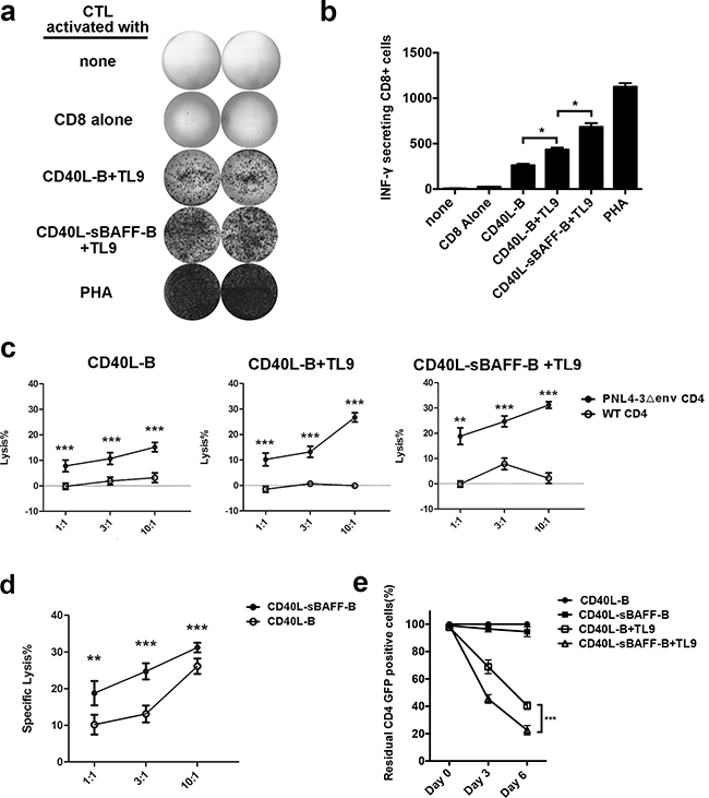 Figure 5: CD40L-sBAFF-B cells pulsed with TL-9 provided an effective APC source to generate HIV-1-specific CTLs. At day 5 after co-culturing, CD40L-B cells and CD40L-sBAFF-B cells were harvested and incubated with peptide TL9 (20 ng/ml) at 37°C for 12 hours. Then autologous CD8+ T cells were co-cultured at a T: B ratio of 3:1 for 7 days with these irradiated B-cells. On day 12, CD8+ T lymphocytes were harvested, washed, and restimulated with fresh TL9-pulsed B cells and IL-2. This was repeated on days 19 and 26. After that, CTLs were co-cultured with HIV-1NL4-△env-EGFP-infected primary CD4+ T cells as target cells. a, b. Representative results of IFN-γ production produced by the educated CTLs. The IFN-γ production was measured by ELISPOT assay. c, d. The educated HIV-1-specific CTLs were mixed with HIV-1NL4-△env-EGFP-infected primary CD4+ T cells as target cells at different E: T ratios. The cell lysis rate was measured with LDH-release assay. e. The calculation of survived HIV-1-infected CD4+ GFP+ cells after co-culture with the educated CD8+ T cells. The CD8 T-cells were educated with various B-cells. Then HIV-1-infected CD4+ GFP+ cells were mixed with the CD8 T-cells at E:T ratio of 3:1 in the presence of IL-2 for 6 days. The proportion of survived GFP+ cells was measured with FACS analysis. The survived GFP+ cells mixed with the CD8+ T-cells generated with TL9 unpulsed CD40L-B cells at day 0 were set as 100%. Data represent mean ± SD (error bars) for a representative experiment of three independent experiments. The student t-test and one-way ANOVA were used. P < 0.05 indicates statistically significance difference. * indicates P < 0.05; ** indicates P < 0.01; *** indicates P < 0.001.
