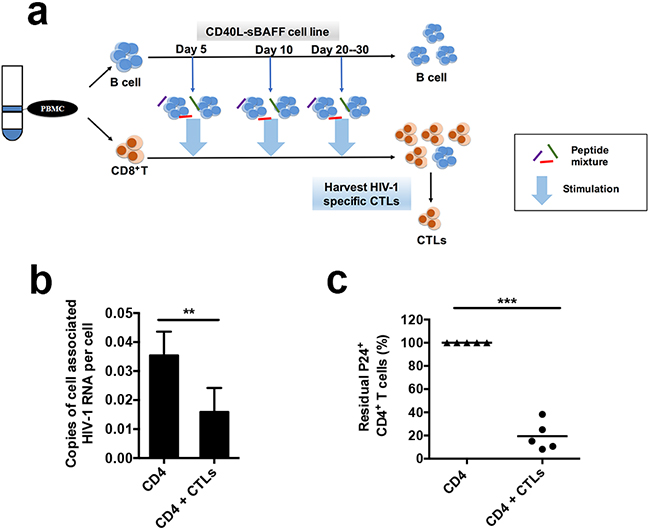 Figure 6: The autologous CTLs educated by CD40L-sBAFF-B cells enhanced the capability to eliminate the reactivated HIV-1-infected CD4+ T cells isolated from HIV-1-infected individuals receiving suppressive cART. a. The manufacturing strategy of HIV-1 antigen-specific CTLs. The PBMCs were isolated from ten whole blood samples of HIV-1-infected individuals receiving suppressive cART. B cells were then isolated and co-cultured with the 293T-CD40L-sBAFF cell line in the presence of cytokine cocktails. The activated CD40L-sBAFF-B cells were pulsed with PepMixes containing WF9, TL9, TP9, HA9, and PY9 as described. Then, autologous CD8+ T cells isolated from remaining PBMCs co-cultured at a T: B ratio of 3:1 with irradiated CD40L-sBAFF-B cells and 20 ng/ml IL-2. T cells underwent three weekly stimulations by co-culture with autologous, PepMix-pulsed B cells. b. HIV-1-infected individuals CD4+ T cells were isolated, stimulated with PHA and IL-2 overnight. PepMix-pulsed B cells-educated autologous CD8+ T cells were added into the culture of CD4+ T cells at the effector-to-target ratio 3:1 in the presence of T-20 to prevent further rounds of viral replication. After 5 days of co-culture, the cell-associated HIV-1 gag RNA was quantified by qRT-PCR. c. The fraction of residual p24+ CD4+ T cells was measured and normalized to the control culture without CTLs. Data represent mean ± SD (error bars). The paired t-test was used. P < 0.05 indicates statistically significance difference. * indicates P < 0.05; ** indicates P < 0.01; *** indicates P < 0.001.