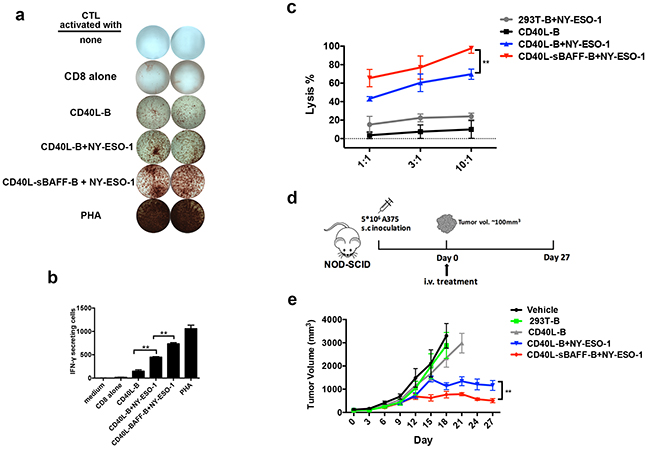 Figure 7: In vivo efficacy of autologous CTLs educated by CD40L-sBAFF-B cells pulsed with NY-ESO-1 in NOG xenograft models. In order to present tumor-antigen to CD8+ T cells, B cells were incubated with NY-ESO-1 (20 ng/ml) for 12 hours, followed by irradiation and co-culture with autologous CD8+ T cells at a T: B ratio of 3:1. After a week, CD8+ T lymphocytes were harvested, washed and co-cultured with B cells for another 7 days. a, b. Representative results of IFN-γ production produced by the B cell-educated CTLs. The IFN-γ production was measured by ELISPOT assay. c. The B cell-educated CTLs were mixed with the NY-ESO-1 expressing melanoma cell line A375 at different E: T ratios. The cell lysis rate was measured with LDH-release assay. d. The strategy of in vivo experiment: NOD-SCID mice were engrafted with A375 melanoma cells (5 × 106) and randomly allocated to five groups which were designated as treatment or control group. Mice were intravenously injected with autologous CTLs educated by NY-ESO-1 pulsed 293T-B cells, NY-ESO-1 pulsed CD40L-B cells, NY-ESO-1 pulsed CD40L-sBAFF-B cells or unpulsed CD40L-B cells. N = 8 mice per group. e. Injection of tumor-specific CD8+ T cells educated by NY-ESO-1 pulsed CD40L-BAFF-B cells effectively inhibited the growth of A375 tumor xenografts in mice. P < 0.01 after twenty days. Mann-Whitney U-test was used.