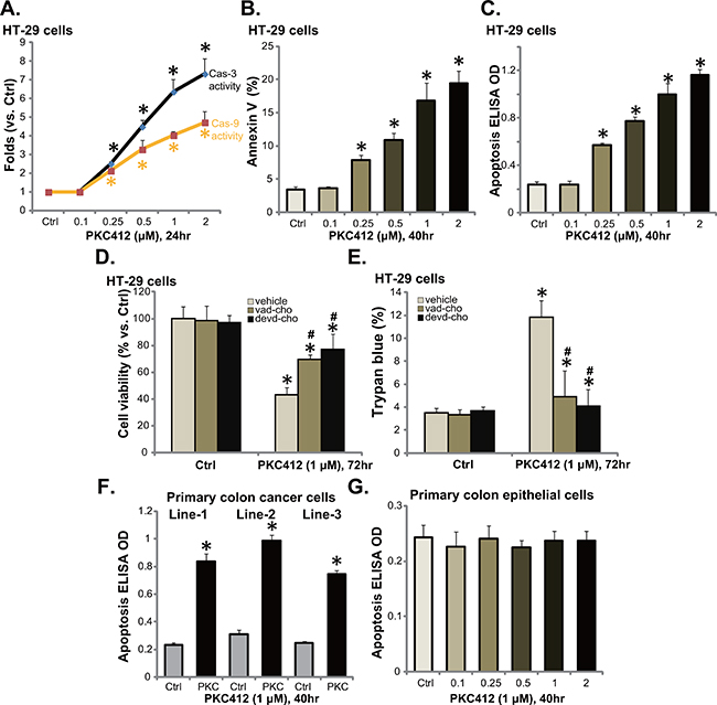 Figure 2: PKC412 provokes apoptosis in CRC cells. HT-29 cells, primary human colon cancer cells, or human colon epithelial cells were treated with designated concentrations of PKC412, cells were further cultured, and cell apoptosis was tested by described assays (A-C, F and G). The effect of pan caspase inhibitor z-VAD-CHO (“vad-cho”, 50 μM, 1 hour pre-treatment) or the caspase-3 specific inhibitor z-DEVD-CHO (“devd-cho”, 50 μM, 1 hour pre-treatment) on PKC412 (1 μM)-induced HT-29 cytotoxicity was tested (D and E). Experiments were repeated three times in this figure, and similar results were obtained. Error bars indicate SD. *p<0.05 vs. untreated control (“Ctrl”) group. #p<0.05 vs. PKC412 only group (D and E).