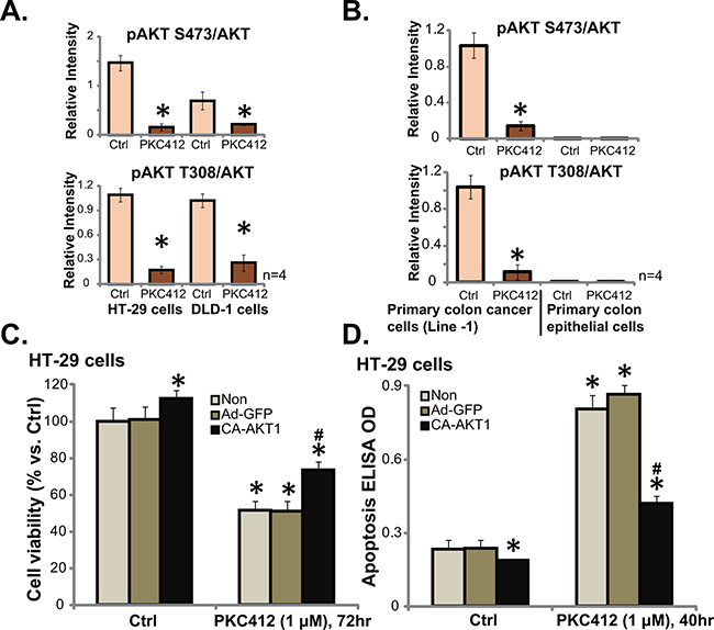 Figure 4: PKC412 in-activates AKT in CRC cells. HT-29 cells (A, left), DLD-1 cells (A, right), primary human colon cancer cells (Line-1, B, left) or colon epithelial cells (B, right) were treated with PKC412 (“PKC”, 1 μM) for 6 hours, cells were further cultured, AKT1 (p- and regular) expression was tested by Western blot assay, and their relative intensity (vs. AKT1) was quantified. Stable HT-29 cells, expressing empty vector (“Ad-GFP”), or constitutively active-AKT1 (CA-AKT1), were treated with PKC412 (1 μM) for applied hours, cell survival was tested by MTT assay (C), and cell apoptosis was tested by ELISA assay (D). “Non” stands for un-transfected parental cells (C and D). Error bars indicate SD. *p<0.05 vs. untreated control (“Ctrl”) group (C and D). #p<0.05 vs. “Ad-GFP” group (C and D).