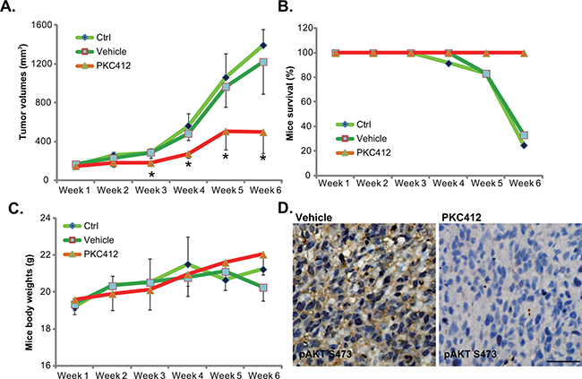Figure 6: PKC412 inhibits HT-29 tumor growth in vivo. HT-29 tumor-bearing nude mice were left untreated (“Ctrl”), or administrated with either PKC412 (100 mg/kg, oral gavage, daily) or the vehicle control (Gelucire 44/14, “Vehicle”), with 10 mice per group; Tumor volumes A., mice survival B. and mice body weights C. were measured weekly for a total of 5 weeks (Week-1 to Week-6). Three days after initial PKC412 administration, HT-29 tumors were isolated, IHC was performed to test p-AKT (Ser-473), and representative images were presented D. *p<0.05 vs. “Ctrl” group (A). Bar=100 μm (D).
