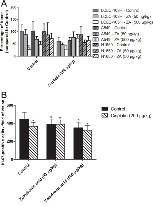 Figure 3: The effect of zoledronic acid on subcutaneous xenografts. The highest dose of zoledronic acid (ZA) significantly inhibited the growth of subcutaneous LCLC-103H xenograft. However, zoledronic acid proved unable to increase the inhibitory effect of cisplatin significantly, albeit the tendency was clear. H358 xenograft tumor expressing mutant KRAS and H160 xenograft tumor expressing activating EGFR-mutation did not show significant effect to zoledronic acid or cisplatin A. (Data are means ± SEM, n=8; *: p=0.032 to solvent treated control.) Cisplatin significantly inhibited numbers of Ki-67-positive LCLC-103H cells in in vivo xenograft tumor, however zoledronic acid was incapable of boosting this effect in the applied doses B. (Data are means ± SEM, n=8*5; *: p<0.05 to solvent treated control.)